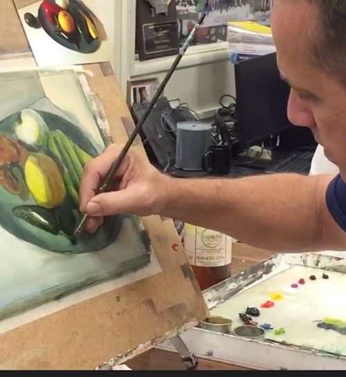 His inspiration comes from the environment and his personal connections to places and people. You'll see a lot of influence from the desert landscape and man made structures on it. He's interested in paths, interiors and windows. He loves to mountain bike, hike and generally be outside where he finds lots of his source material.